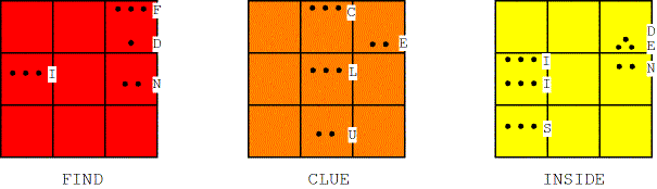 of horizontal "slots" that are occupied uniquely by rows of dots. On the red and